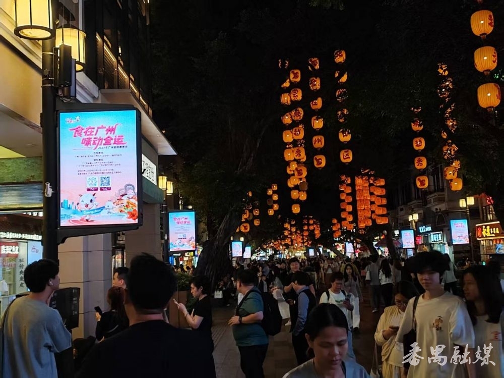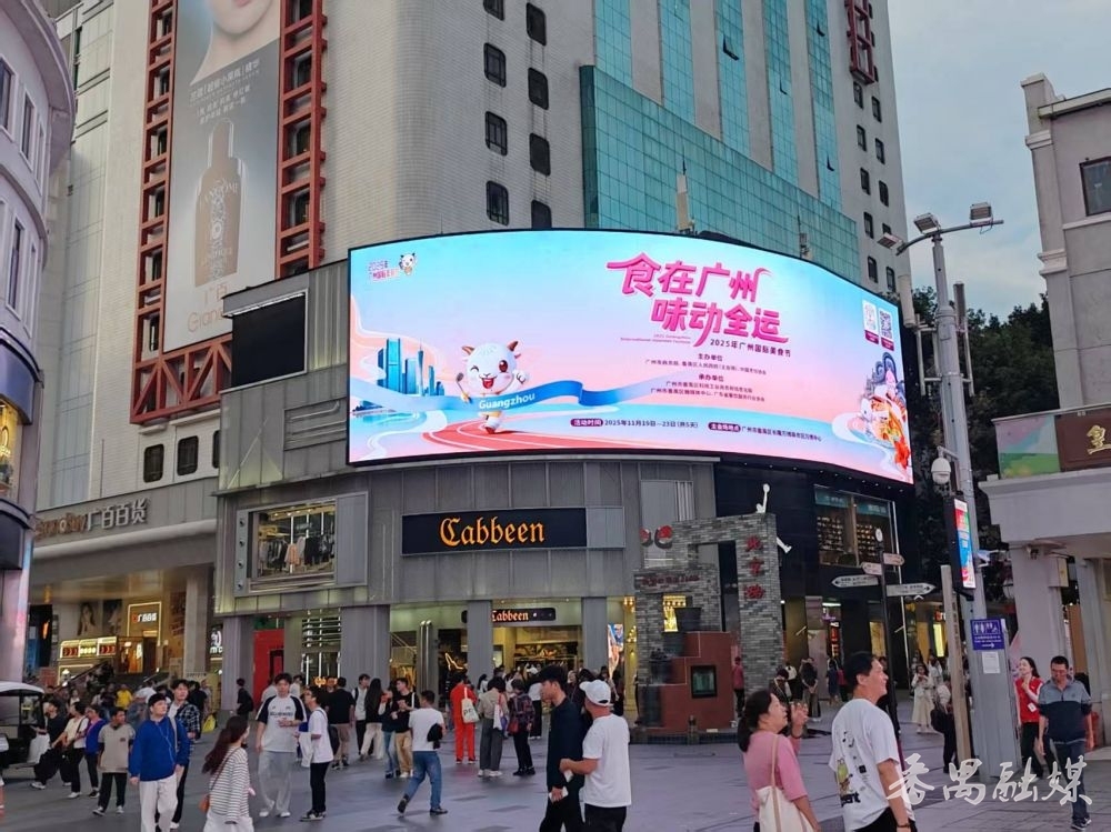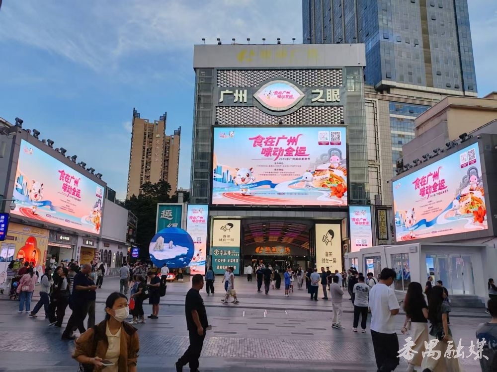 广州市北京路“广州之眼”及步行街的户外电子大屏,2025年广州国际美食节的宣传画面以“食在广州 味动全运”为主题,搭配可爱的十五运会吉祥物与美食图,将广府风味与全运元素相融合,市民抬头就可以了解到广州国际美食节的相关信息。