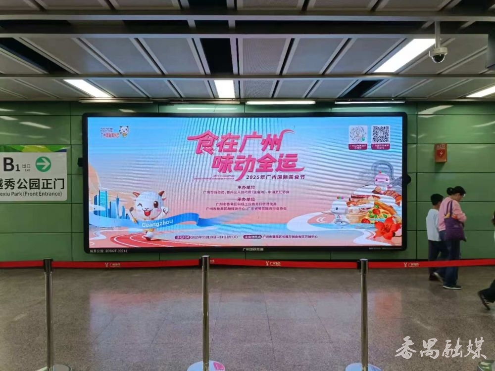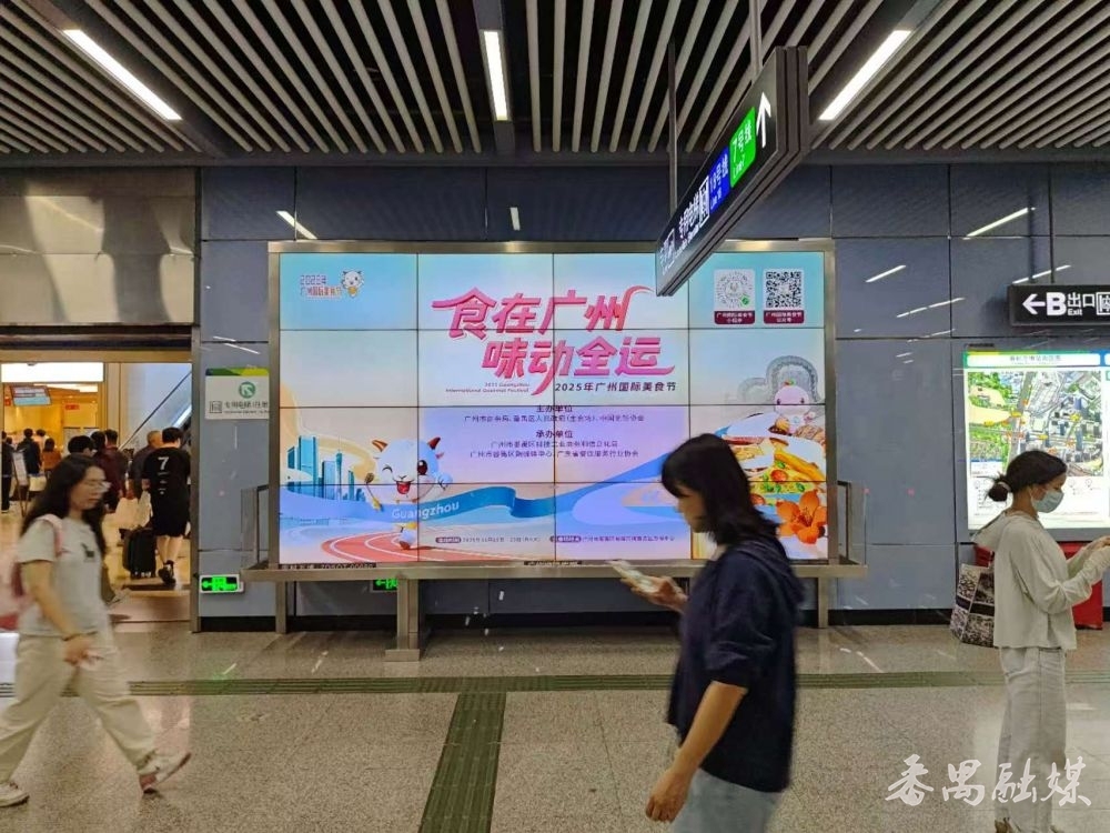 广州地铁二号、三号、七号、八号等多条线路车站的电子屏也同步上线2025年广州国际美食节的宣传画面,上面清晰标注了美食节时间、地点、主办单位等信息,吸引乘客驻足屏前,有的乘客还用手机扫码,了解更详细的情况。